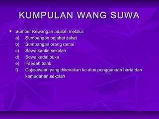Baca versi flipbook dari buku tatacara kewangan sekolah 2012. Kewangan sekolah terdiri daripada tiga sumber iaitu Wang SUWA Wang KERAJAAN dan Wang ASRAMA bagi yang ada asrama. Bahkan kejayaan sistem pengurusan kewangan sekolah ini membolehkan urusan kewangan sentiasa berada di tahap yang sangat baik.